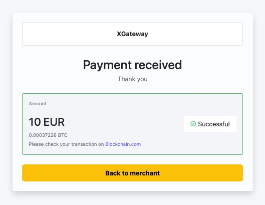 After checkout, we validate the payment on the blockchain and automatically mark the invoice as paid once funds are received. After that the customer is redirected to the success page.